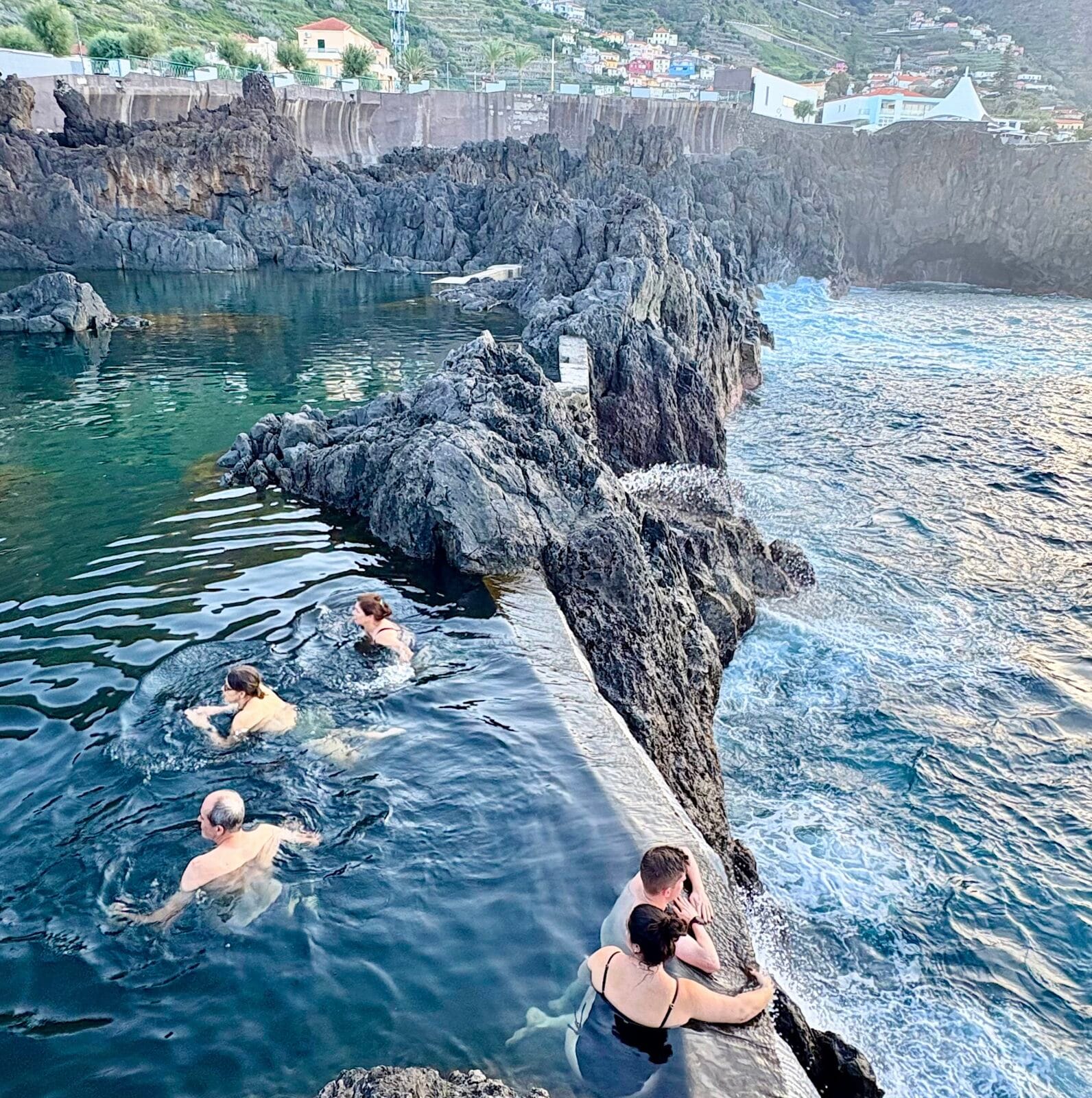 The eight-day hiking trip included stays at three hotels, all with swimming pools. For many reasons, my favorite mountainside village was laid-back Porto Moniz. My home for two nights was the Aqua Natura Madeira Hotel, located across the street from the town’s main attraction, the natural pools. According to CNN, these natural salt pools are considered the world’s best tidal and ocean-side pools. Formed by ancient lava, the ocean water floats and crashes over the rocks and refills the pools. From above, Porto Moniz — with its imposing mountains dotted with winding roads, red-roof homes, and manicured gardens — looks like a living painting.